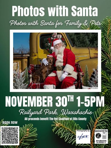 BOOK NOW:https://form-renderer-app.donorperfect.io/give/pet-coalition-of-ellis-county/2025-santa-pics — with Affurmative Dog Grooming LLC and CFXimages.