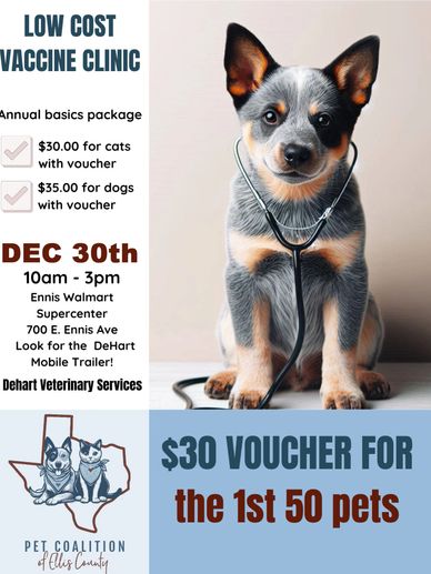 We will be providing $30 vouchers to the 1st 50 pets who come for annual wellness vaccines at Ennis Walmart - look for the big DeHart Moblie Veterinary Services Trailer!