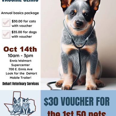 October 14th - from 10am - 3pm- we are hosting a low cost vaccine clinic at the Walmart in Ennis. This event is in partnership with DeHart Veterinary Services and Flying B Animal Rescue & Sanctuary and will be first come, first serve. We are providing $30 vaccine vouchers fo the first 50 pets. This is a great way to get your pet up to date on annual vaccines. Hope to see you there!